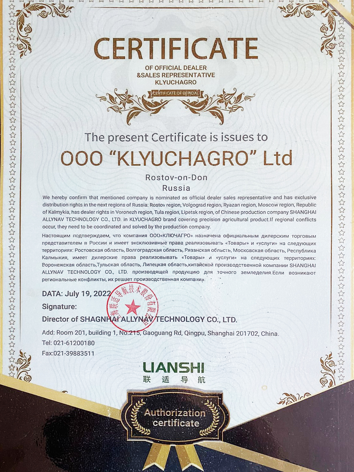 Сертификат подтверждает, что дочернее предприятие компании АГРОнавигация - компания КЛЮЧАГРО является официальным дилером AllyNav Technology Co., Ltd на территории Ростовской, Волгоградской, Рязанской, Московской областях и республики Калмыкия.